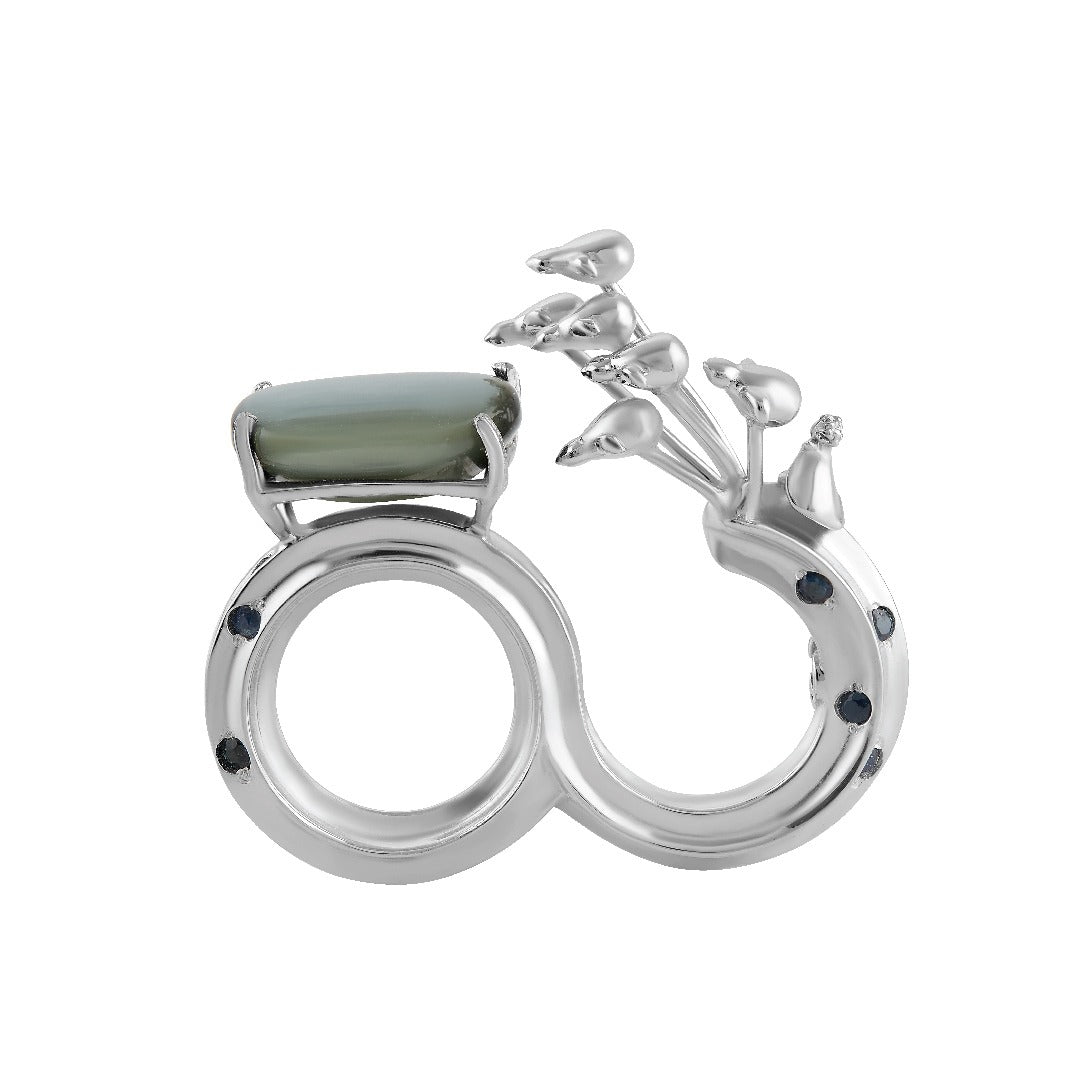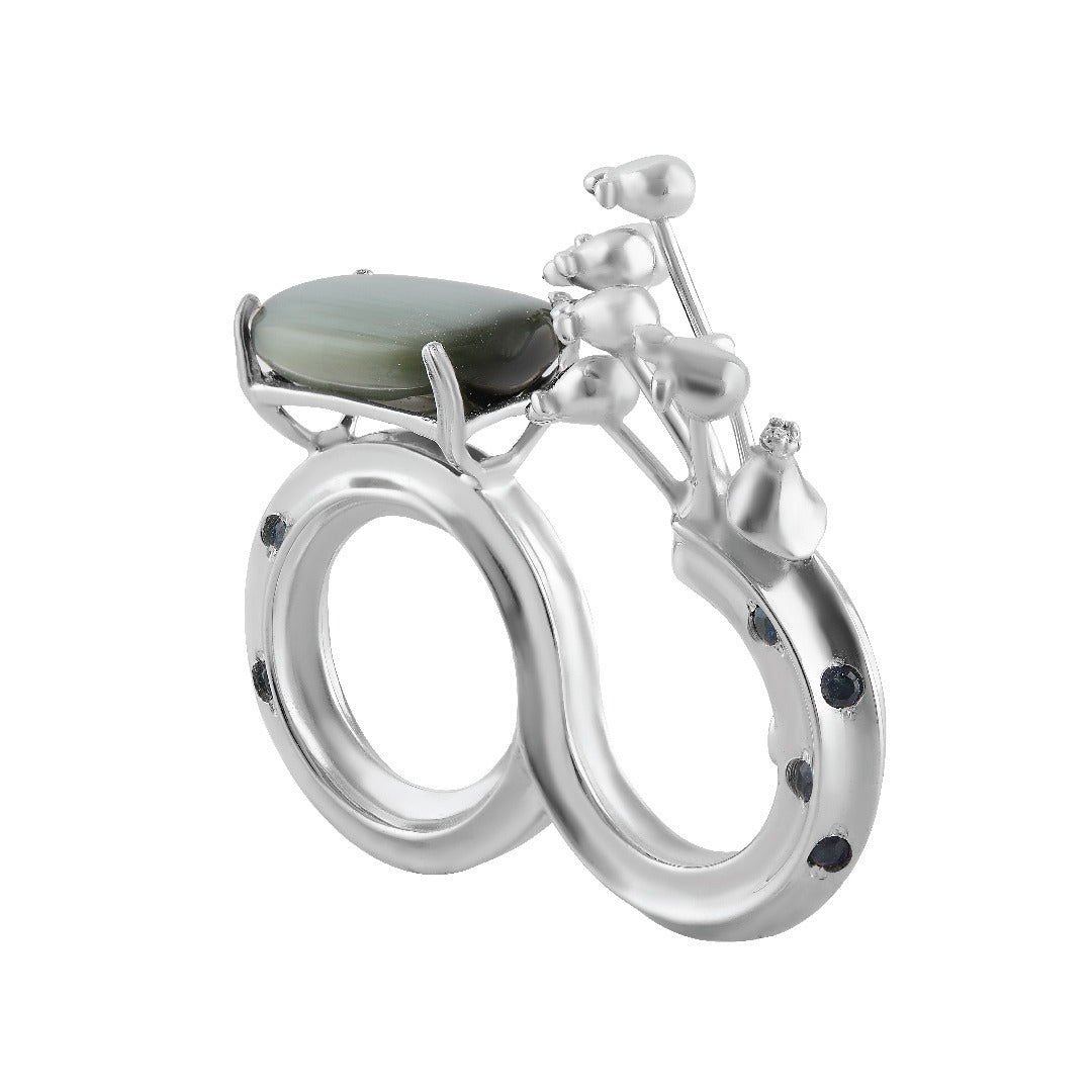 Anillo doble, Plata .925, Baño de Rodio blanco, 1.25 ct de Zafiros, Enorme Feldspar Ojo de Gato.