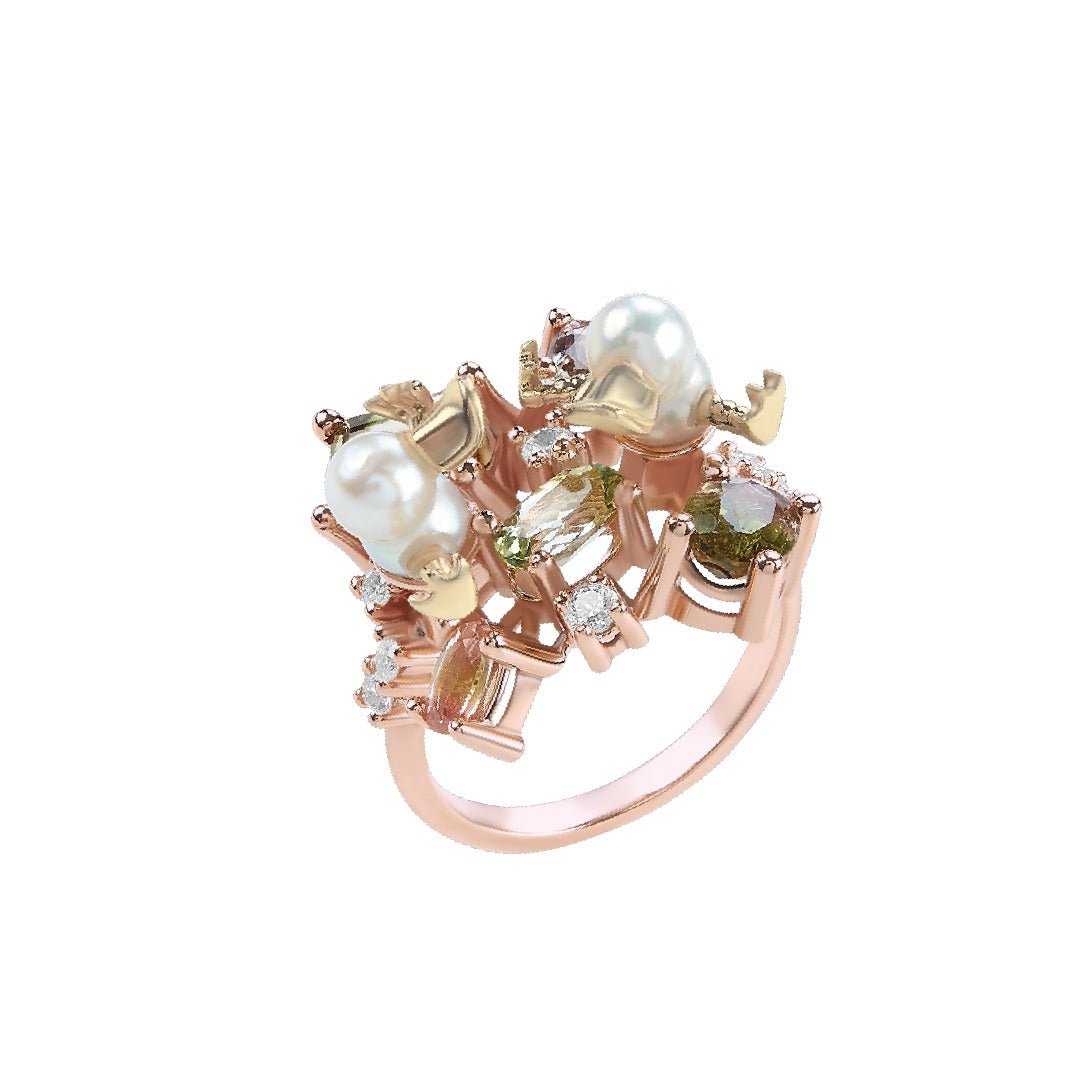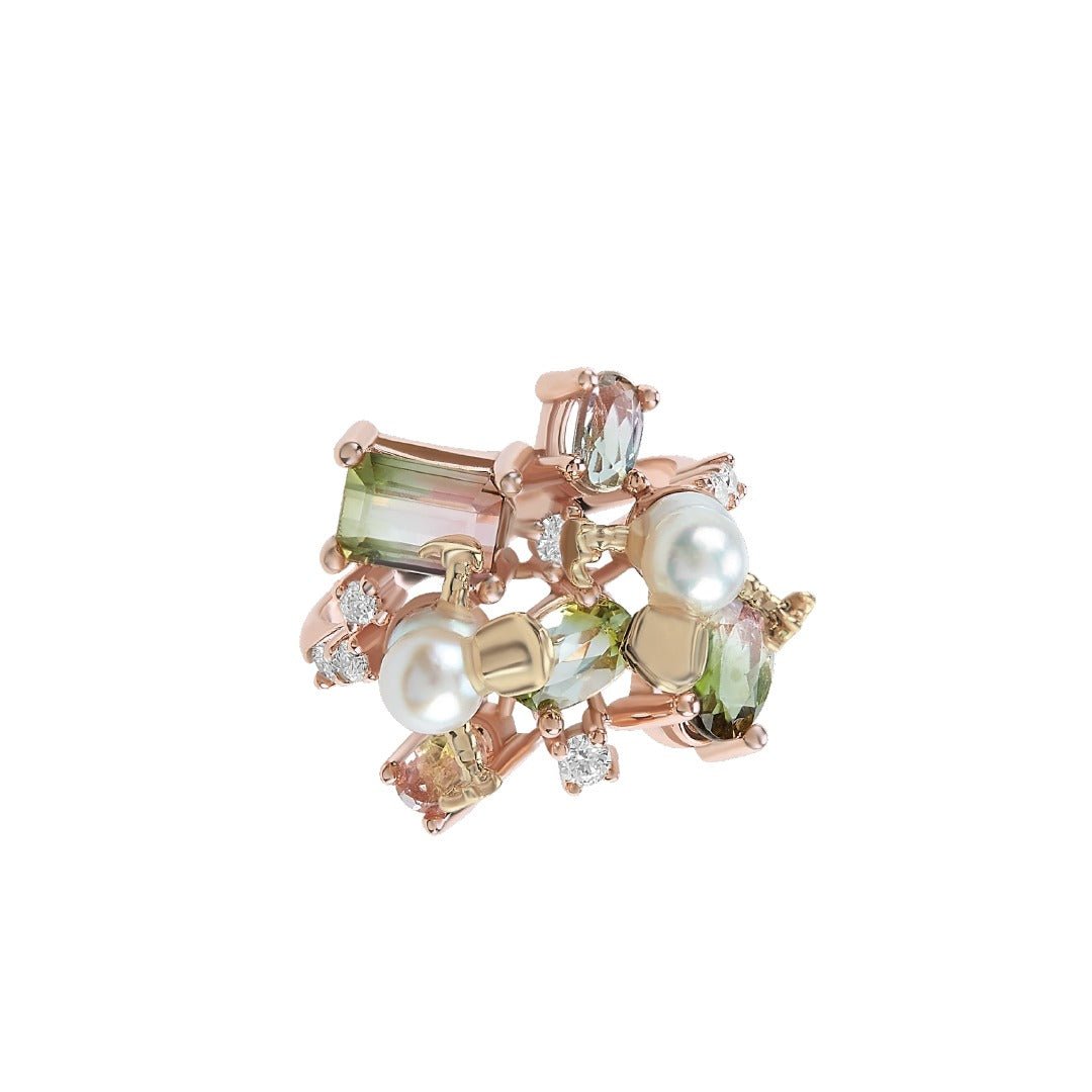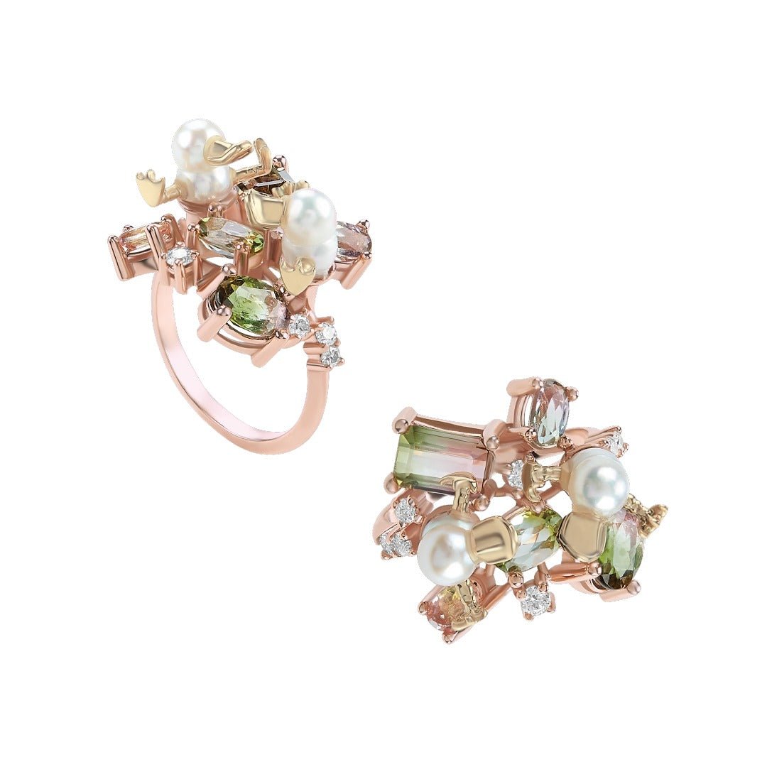 Oro 14k Rosa 2.67 ct Turmalinas Sandía, .26 ct diamantes, Perlas Twin Akoya
